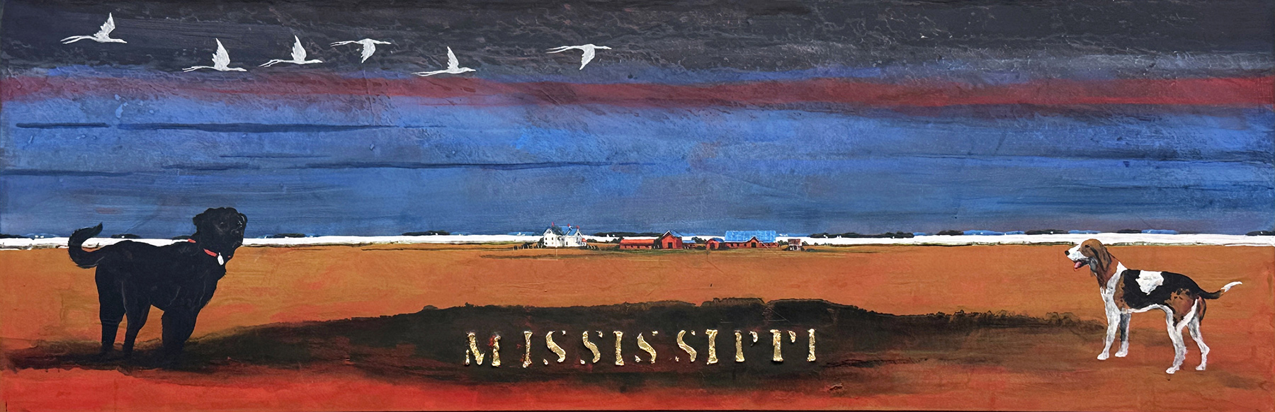 William Dunlap is one of the most important and celebrated painters in Southern art today. His mixed-media canvases, constructions, installations and works on paper are what he calls “Excavations” of Southern culture, literature and landscape. They are a rich vernacular for what it means to live in “The American South”. His Delta landscapes are often inhabited by Walker Hounds, Antebellum homes, cooling towers and other reminders of industrial and agricultural incursion into the landscape. Numbers and words seep up from this ground into the air like the humidity in a Southern sky. Dunlap’s work fuses the sublime into a rich pageantry of what has come before, what is now and what will be in a gumbo-like stew of Southern narrative. Says the artist of his work – tongue in cheek, “I call what I do hypothetical realism, these places, situations and events I paint are not real but they could be.”